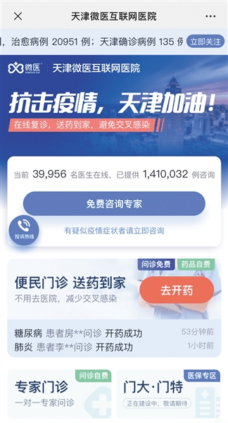 除針對新冠肺炎的免費義診之外,圍繞慢性病和常見病的便民門診、心理援助專區(qū)和醫(yī)護人員心理關(guān)懷通道也快速開通,天津微醫(yī)互聯(lián)網(wǎng)醫(yī)院率先成為天津抗擊疫情的“第二戰(zhàn)場”。